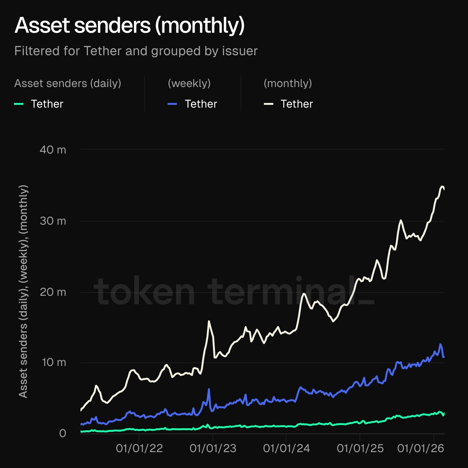 11. Asset senders (monthly). Measures the number of unique addresses that initiated a transfer of the asset in the past 30 days. The most stable of the three. Use this for longer-term adoption tracking.