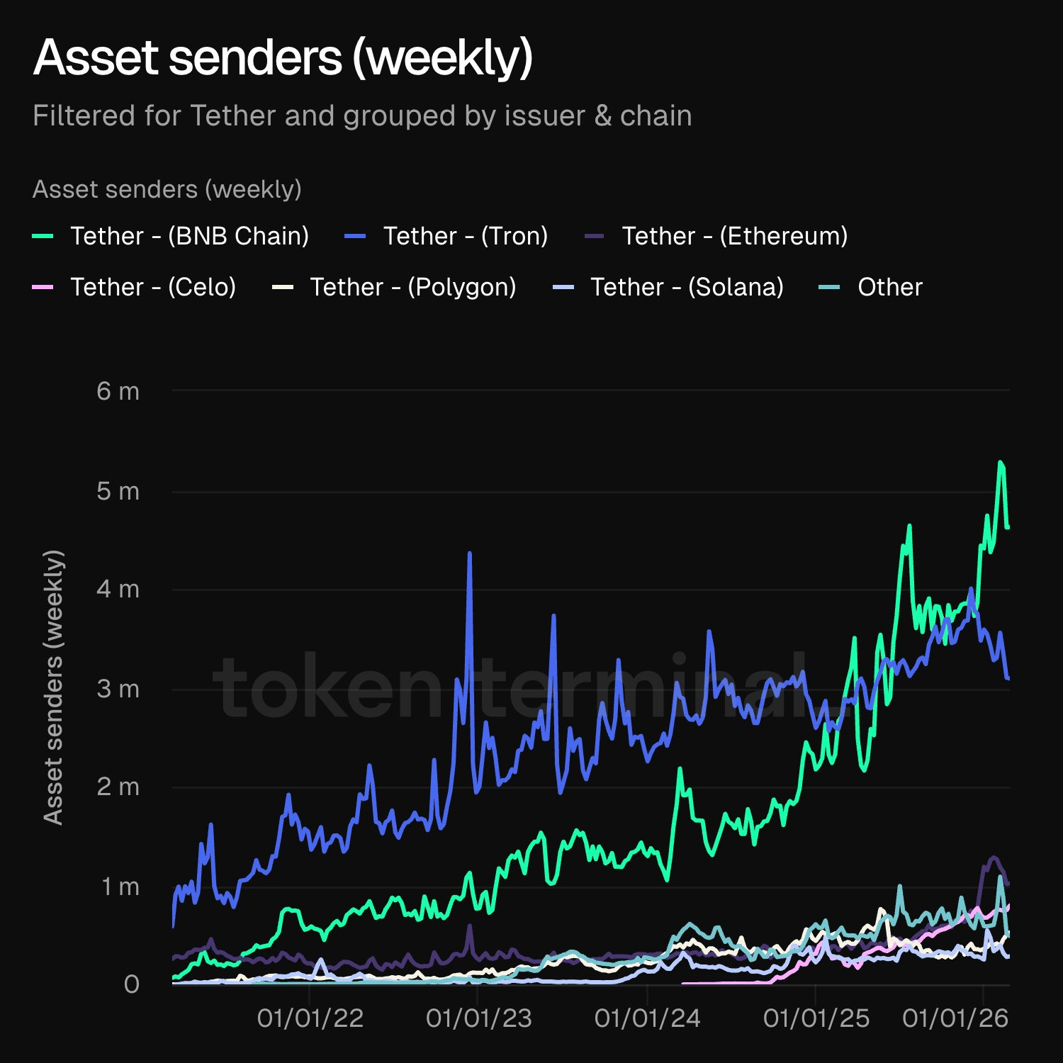 10. Asset senders (weekly). Measures the number of unique addresses that initiated a transfer of the asset in the past 7 days. Smooths out daily noise. Better for week-over-week trend analysis.