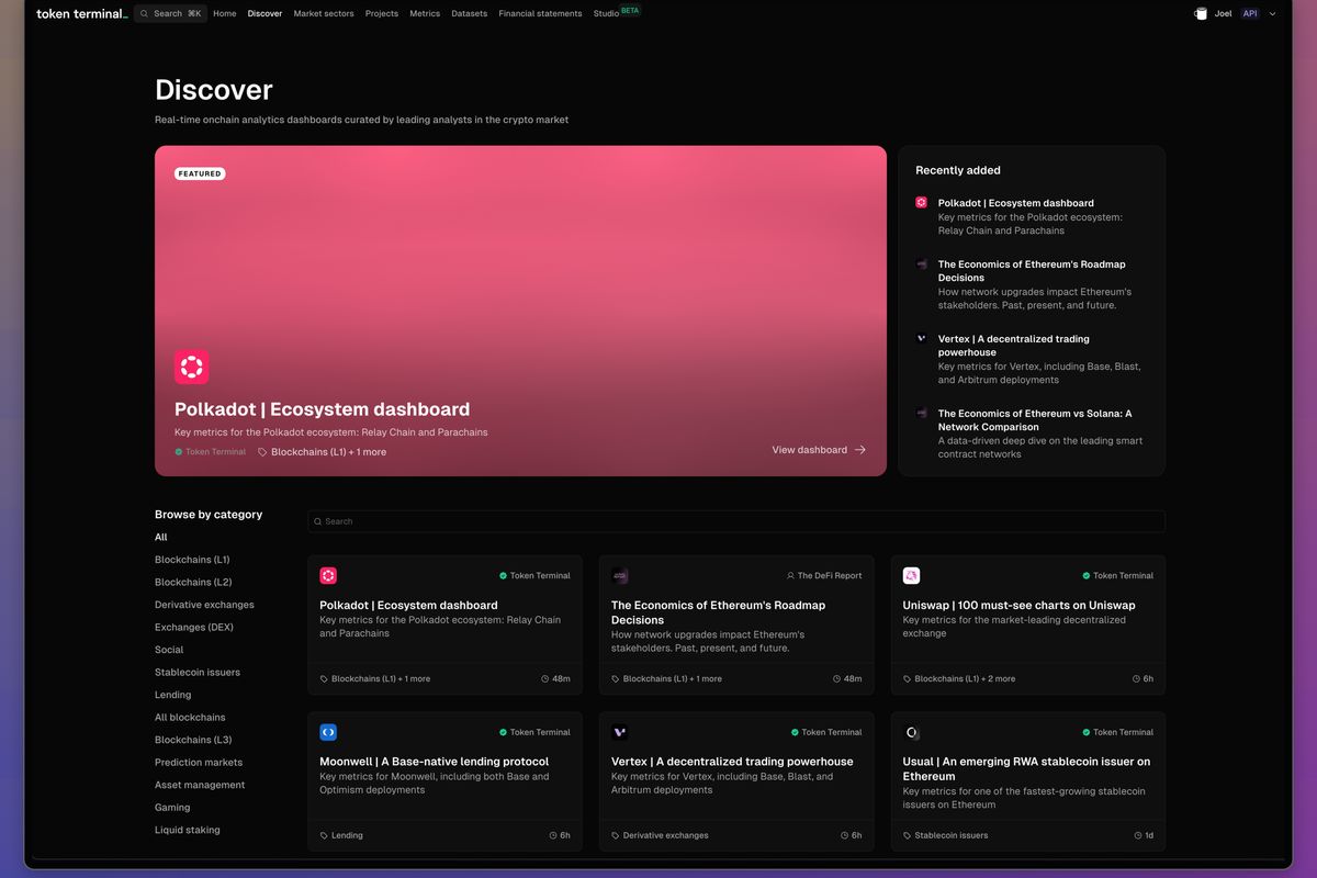The Discover page on Token Terminal showcases top-tier research from community analysts focused on specific market sectors or projects. Opting into sharing research here enables analysts to build a brand and share valuable insights directly to a global audience of leading crypto investors and entrepreneurs.