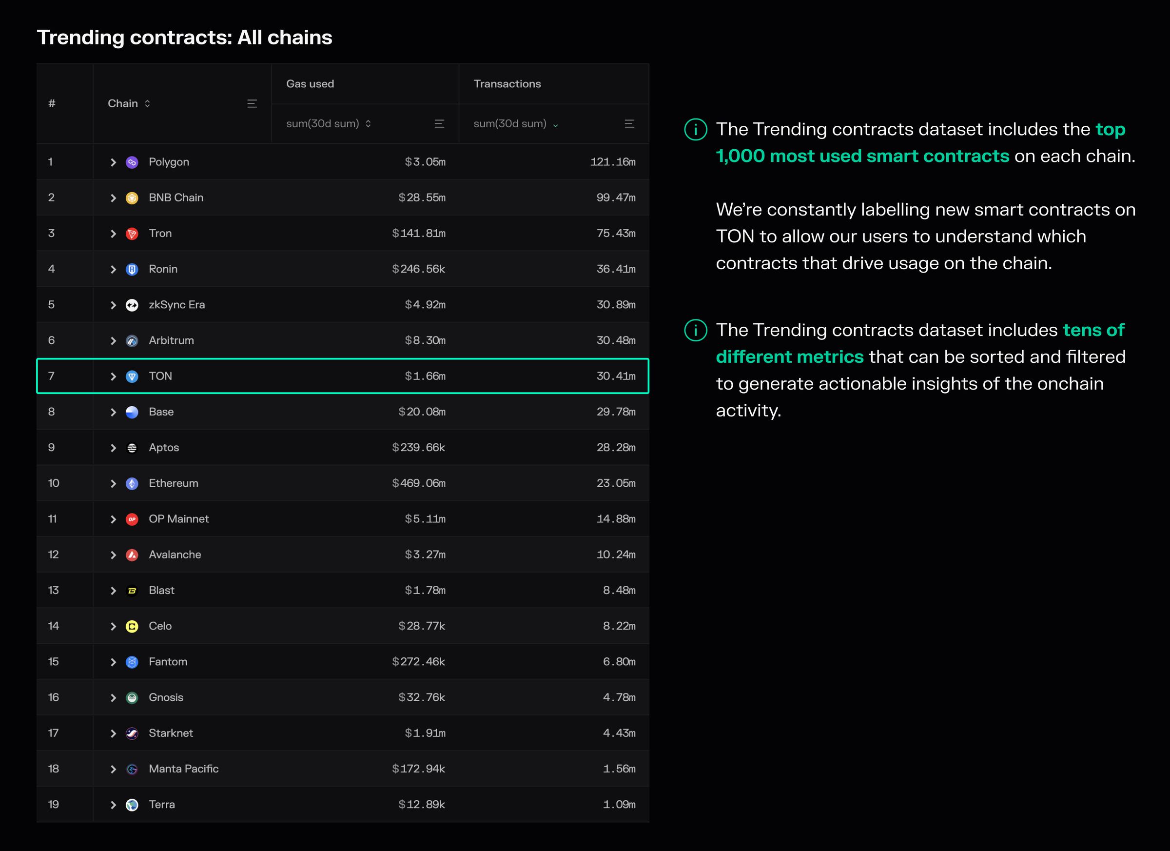 Further, we enable analysts to understand which market sectors, projects, and contracts drive usage on TON.