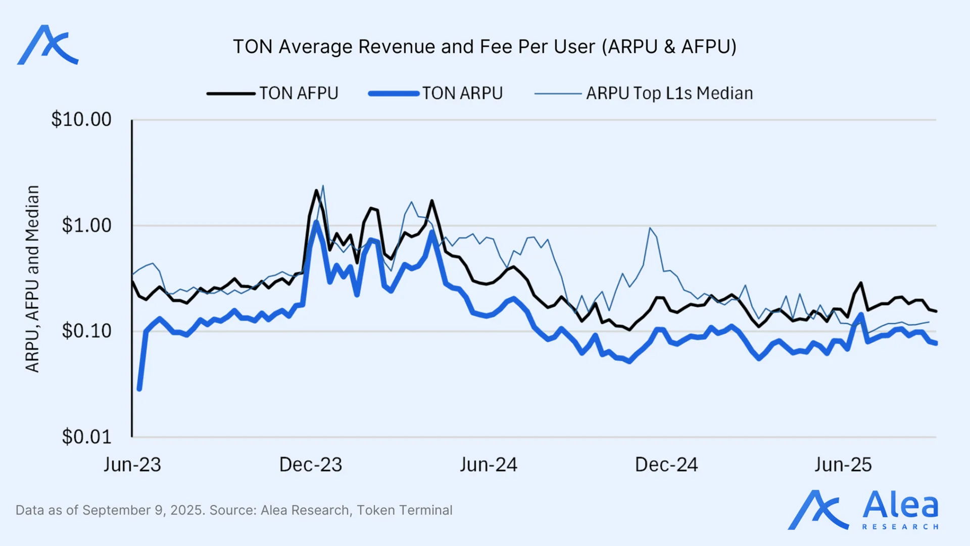 TON’s average revenue per user (ARPU) and average fee per user (AFPU) spiked in late 2023, but have since leveled off. TON’s ARPU is lower than L1 comps, reflecting modest monetization, despite a growing user base.
