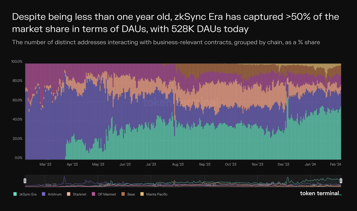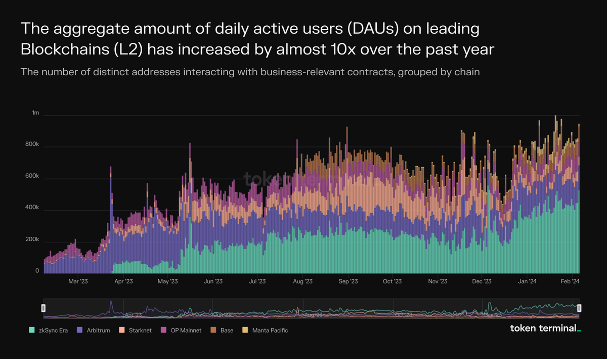 A year ago, the only operational L2 blockchains tracked by Token Terminal were Arbitrum, OP Mainnet, and Starknet. Today, their DAUs are up 168%, 351%, and 927%, respectively.