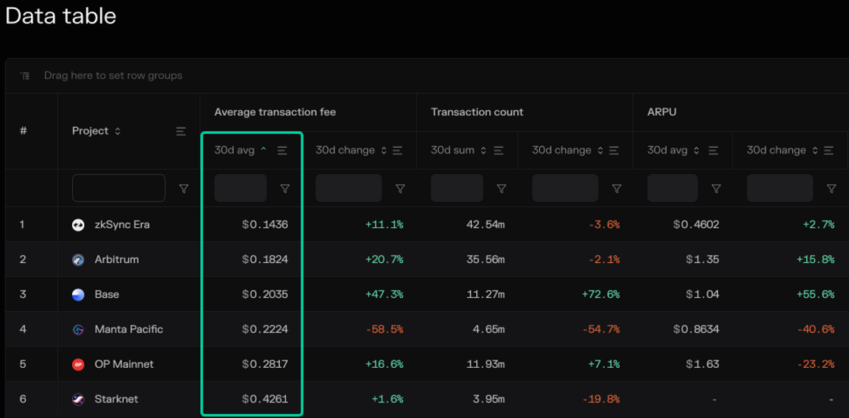zkSync Era had the most transactions (42M) and the lowest average transaction fees ($0.14) over the past 30 days. In contrast, Starknet had 10x fewer transactions (4M), but almost 3x higher average transaction fees ($0.42). To better understand the reason for the difference, we’d need to look at a breakdown of the transaction types for each.