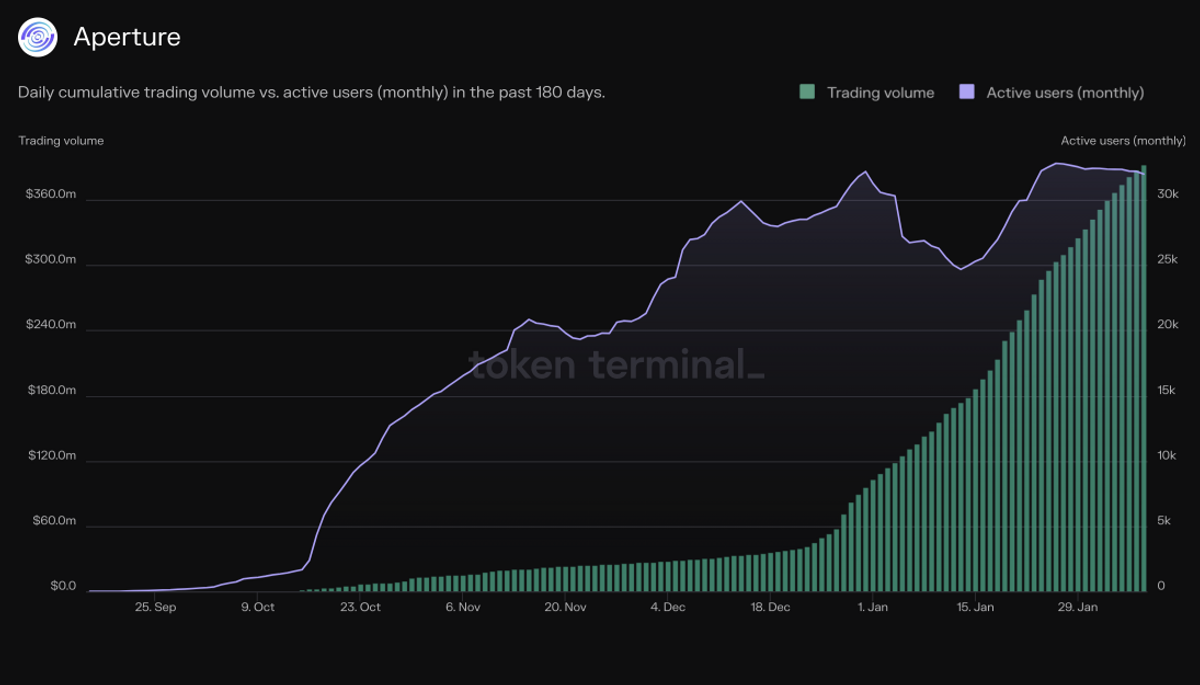 As of today, Aperture serves over 32K monthly active users and has generated $393M in cumulative trading volume since September '23. Aperture is currently responsible for the vast majority of total trading volume across DEXs on Manta Pacific.