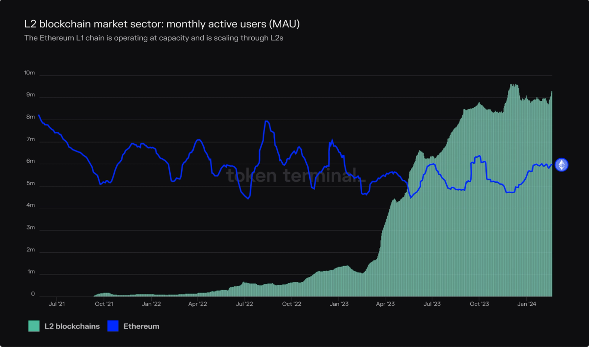 It was clear from the very beginning that a single chain, here the Ethereum L1 chain, could never scale to a point where the global economy could run on it. As a result, Vitalik laid out an L2-centric scaling roadmap, which describes how Ethereum scales vertically through thousands of L2 chains that are all technically and/or brand-wise connected to the main L1 chain. This vision has gone from R&D to reality over the past four years, as Ethereum L2s today host close to ~10m MAUs vs. Ethereum L1’s ~6m MAUs.