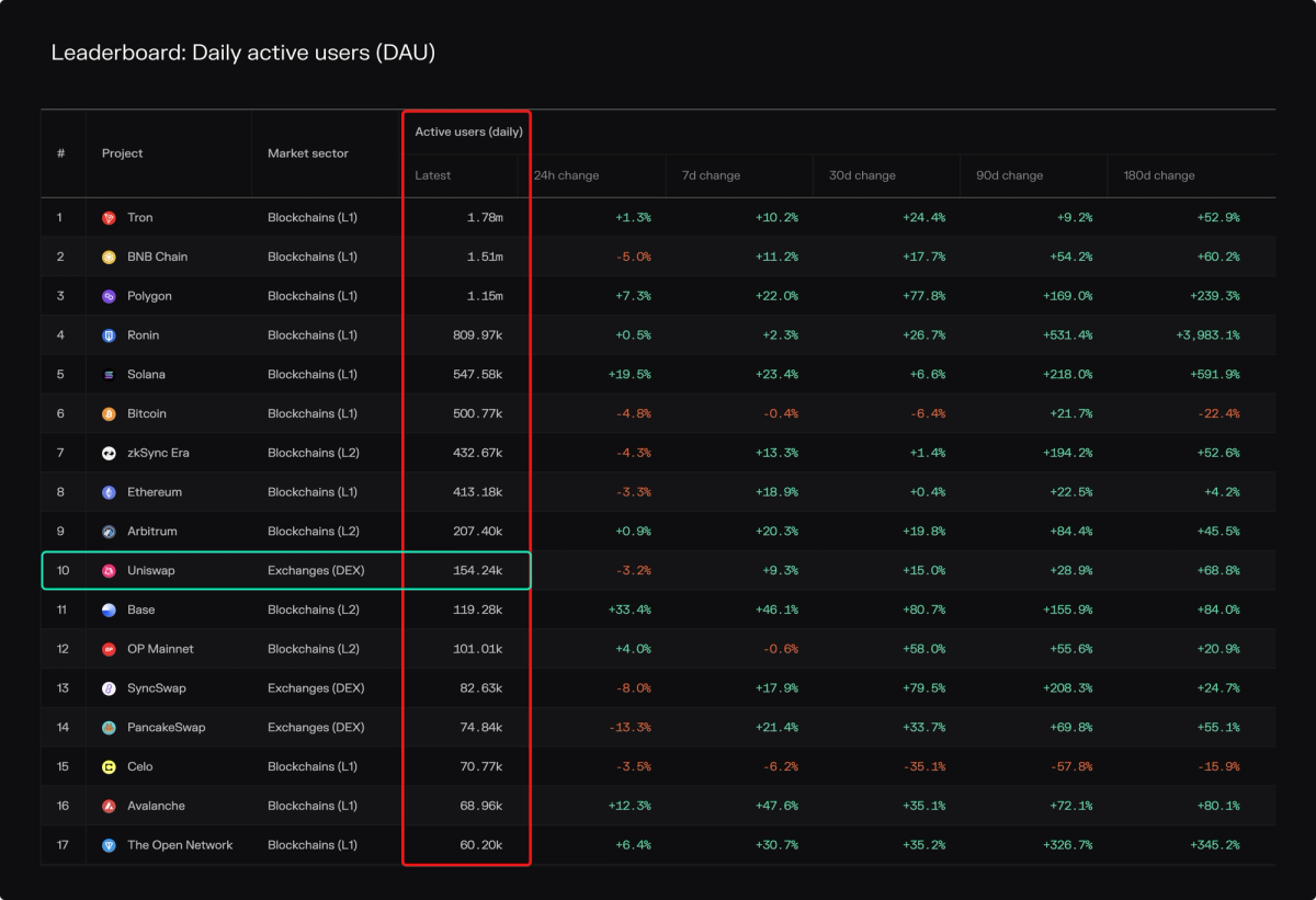 Key takeaway: Uniswap is the most used application (aka not a blockchain) in the crypto industry.