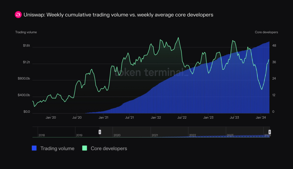 Key takeaway: Uniswap is a great example of “developer leverage”: ~40 core devs → ~$1.7 trillion in trading volume.