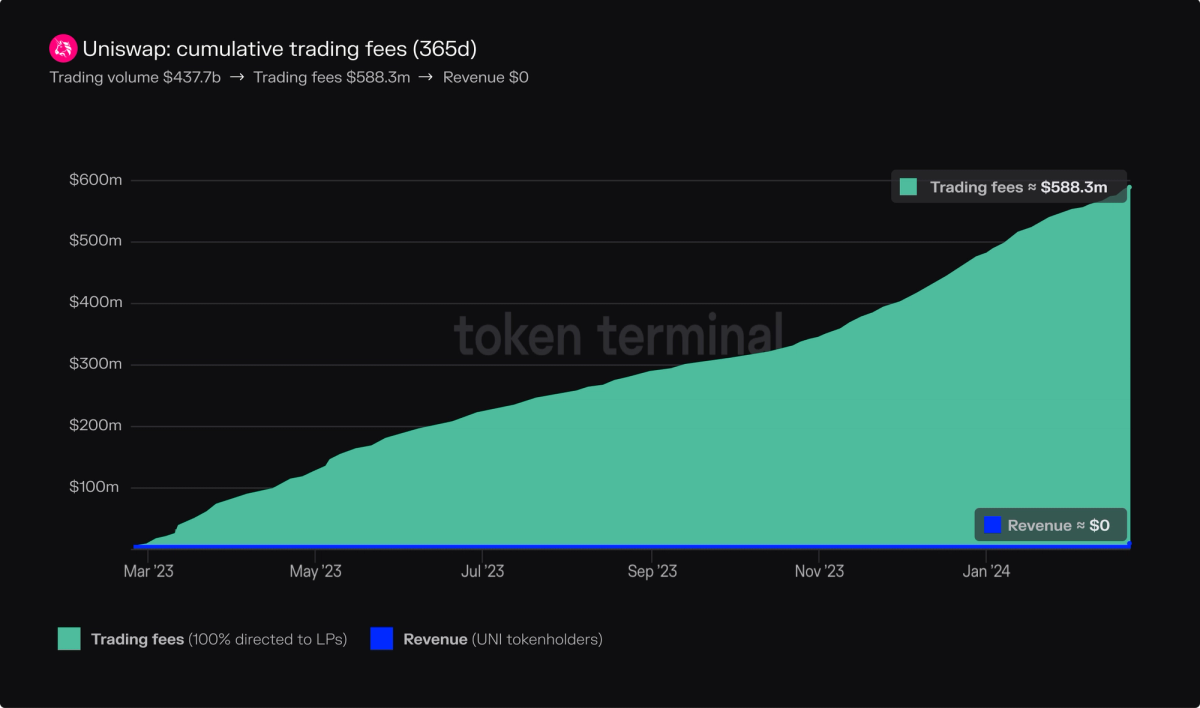 The Uniswap protocol facilitated $437.7b in trading volume over the past year. That volume resulted in traders paying an aggregate of $588.3m in trading fees. Because Uniswap hasn’t activated its fee switch, it earned $0 in revenue from those fees.