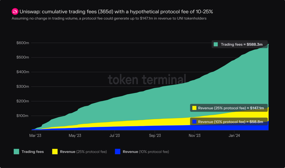 Prior “fee switch” proposals have failed to get enough support. The proposal presents a model for how the DAO could turn on the fee switch, so that a percentage of the trading fees would accrue to UNI tokenholders.