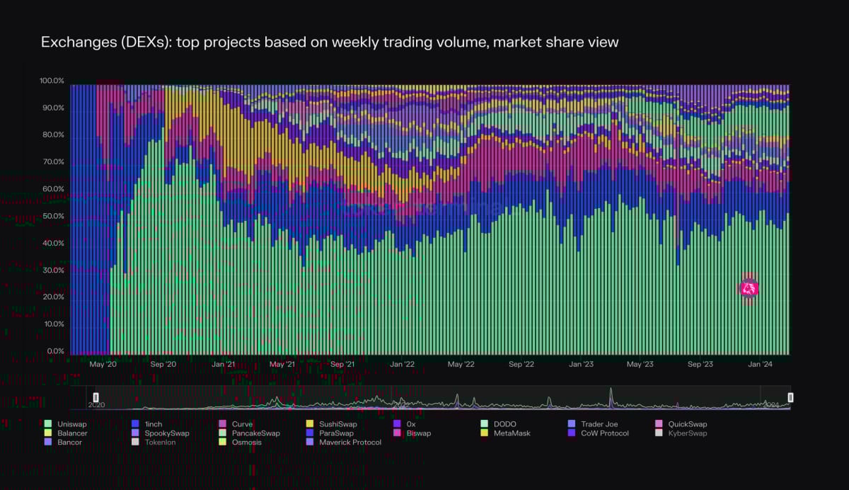Key takeaway: Uniswap has ~50% market share in the decentralized exchange (DEX) market sector.