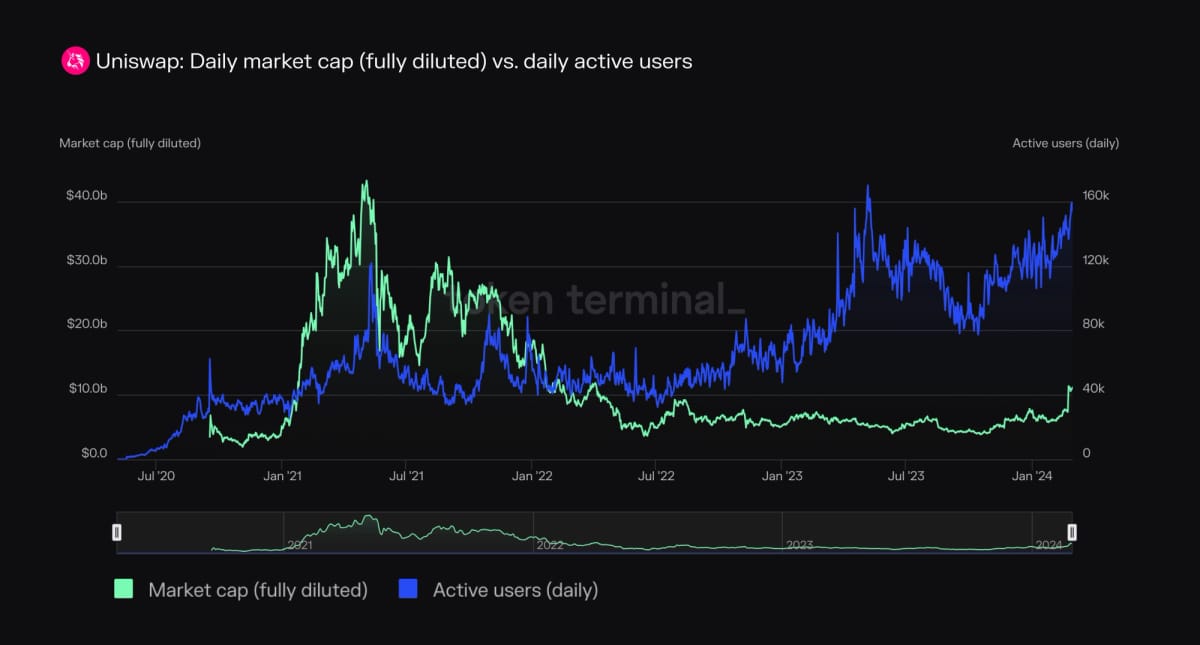 Key takeaway: Uniswap DAUs show sustainable long-term growth, while the market cap is slowly picking up.