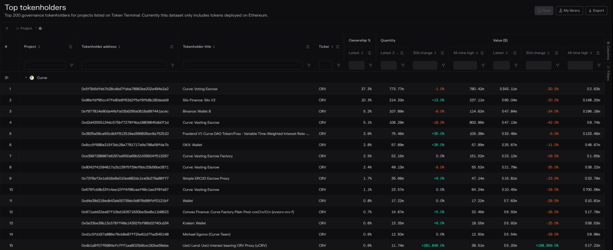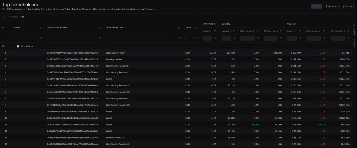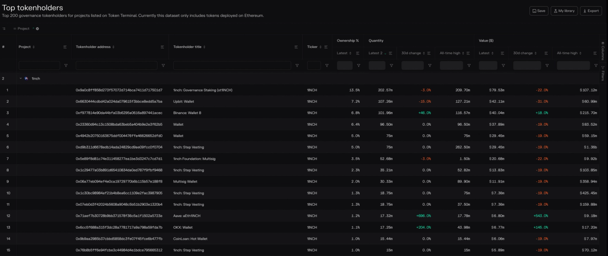 The Top tokenholders dataset displays the top 200 governance tokenholders for projects listed on Token Terminal.