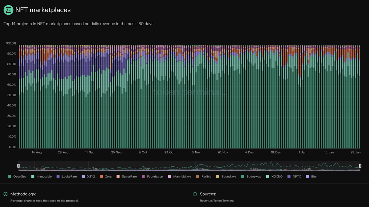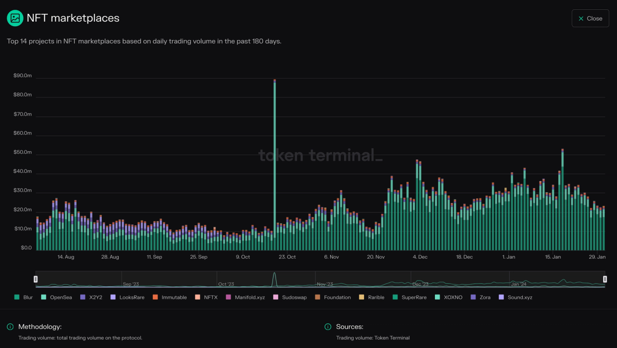 Blur has continued to capture market share in the NFT marketplace sector, capturing close to 80% of the total trading volume. The increase is notable, with Blur's trading volume up 87.5% over the past 180 days. Blur's dominance has significantly impacted OpenSea's market share, which has fallen to ∼16% from ∼40% before the launch of Blur in late '22.