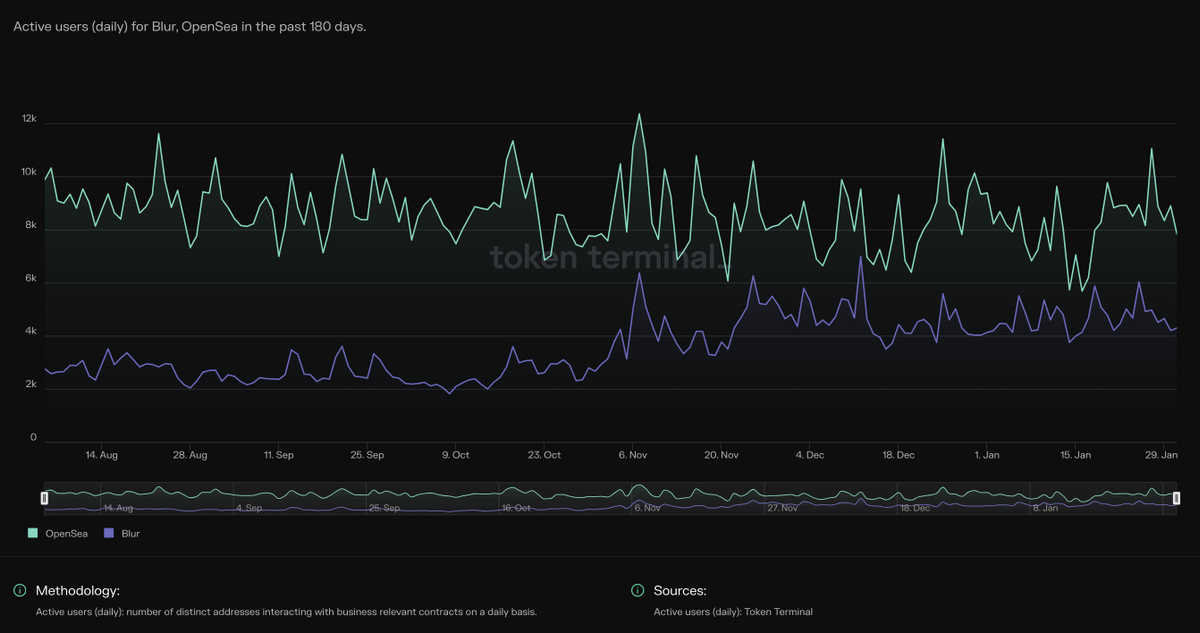 Despite Blur's significant share of total trading volume, OpenSea continues to lead in terms of revenue and daily active users (DAU). This situation of dual leadership in the market underscores a competitive landscape where high trading volumes do not necessarily translate to higher revenues, highlighting the distinct strategies and value propositions of each platform.