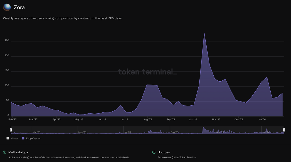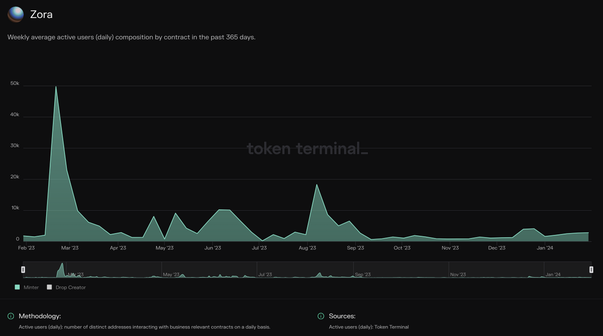 Following the surge in activity triggered by Coinbase's ‘Base, Introduced’ NFT drop in February '23, Zora has experienced a downtrend in the number of minters. While we've seen Zora's capability to attract major one-off collaborations, the subsequent decline in minters raises concerns about the platform's long-term demand and ability to retain users.