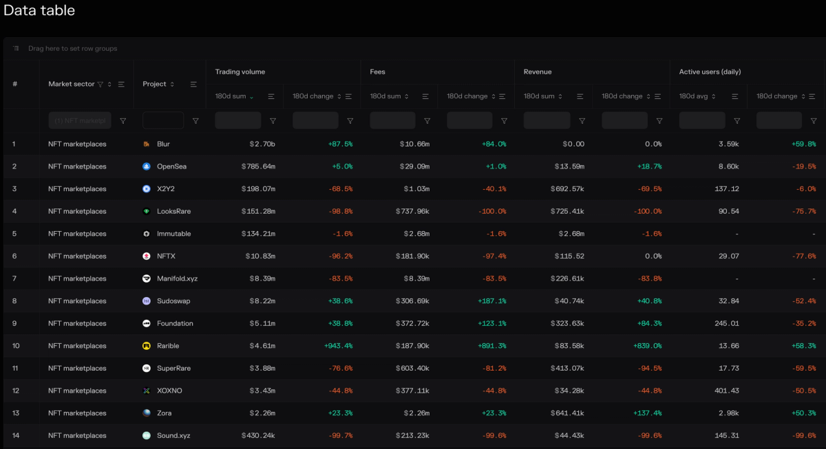 Top 14 projects in NFT marketplaces sorted based on 180-day trading volume.
