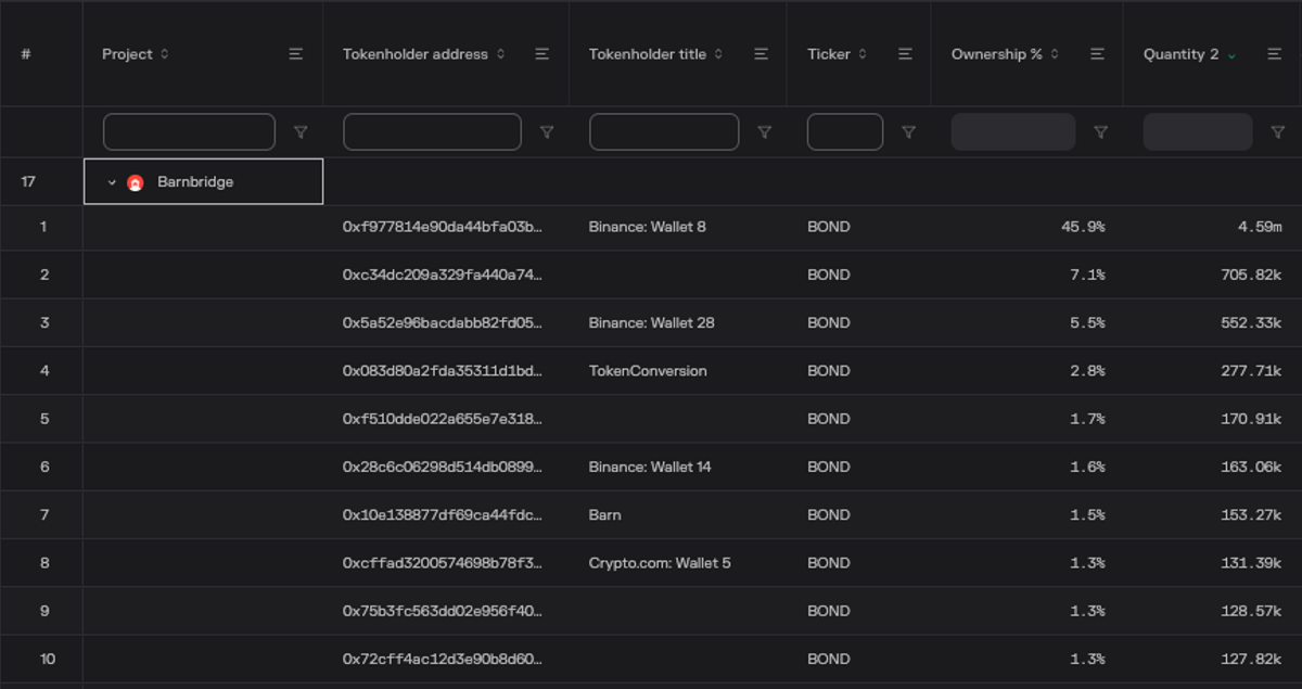 Assess project ownership and control. The dataset offers a detailed breakdown of ownership percentages of a project's governance token by address. For investors, understanding this distribution is crucial as it directly impacts their stake and voting power. For instance, it is notable that over 50% of BarnBridge's total supply is held in Binance-associated wallets.