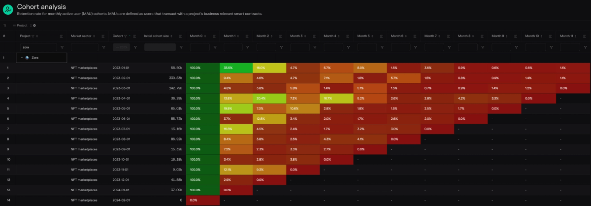 Retention rate for Zora's monthly active user (MAU) cohorts since Jan '23.