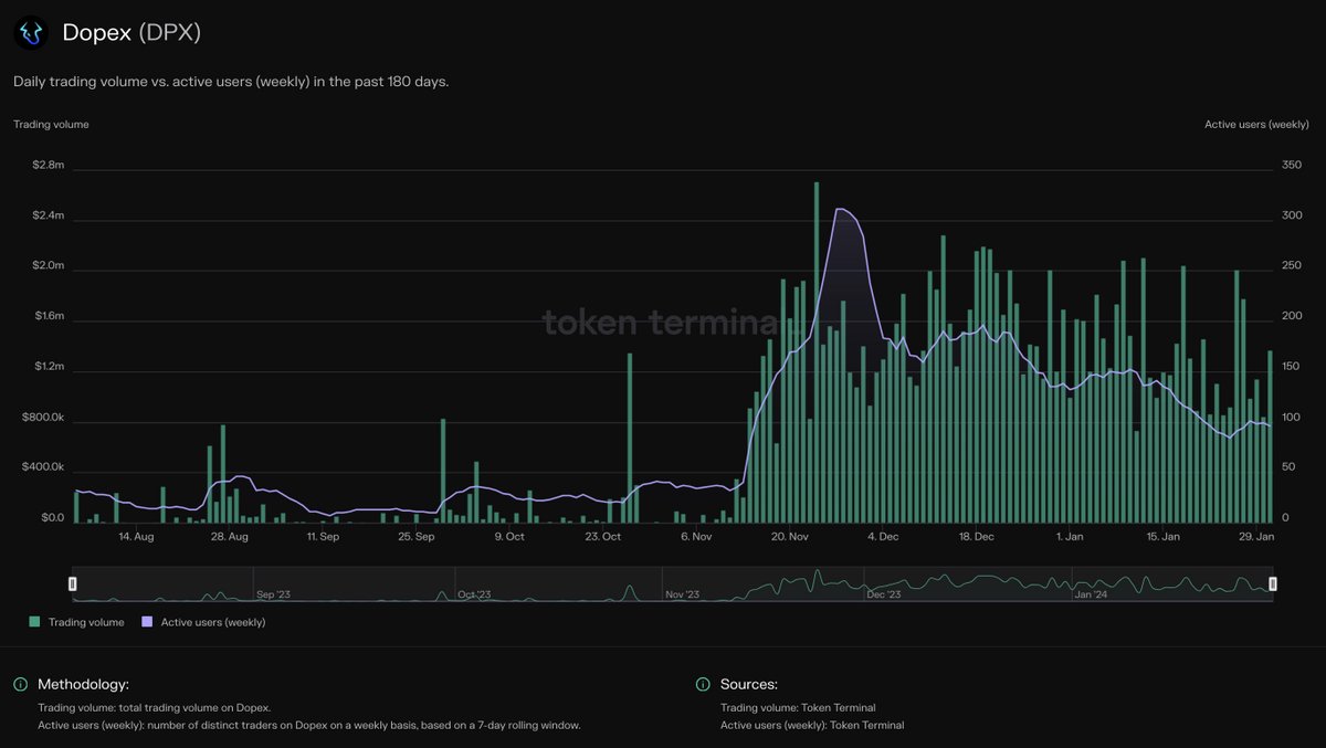 Liquidity providers deposit funds into Dopex and receive premiums from options traders (supply-side fees). DPX tokenholders own and govern the protocol. They currently take a cut of the total trading fees paid by traders (revenue). Dopex’s investors include Tetranode, DefiGod, Orca Traders, Pattern Research, etc.