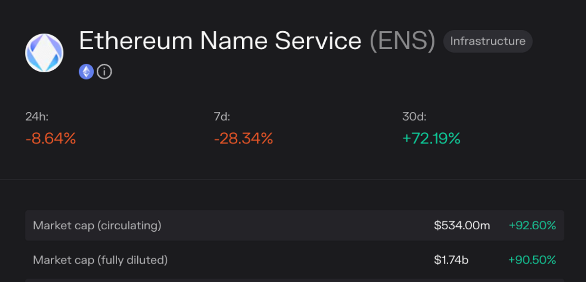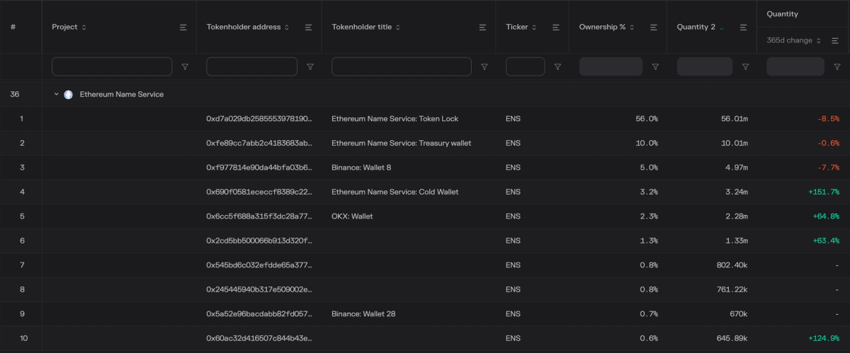 ENS's Top tokenholders as of 23.1.2024, their Token Lock, Treasury wallet and Cold wallet balances are all excluded from the circulating supply.