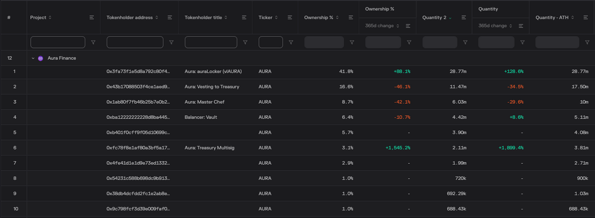 Insights into token flows. An analysis of Aura Finance's Top tokenholders indicates a substantial growth in tokens locked into vlAURA, with an increase of 128.6% over the last year. This growth represents an 88.1% rise in its proportion of the total token supply.