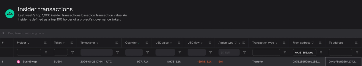 Use the Insider transactions dataset to dive deeper. The Insider transaction table provides a more granular view into recent balance shifts among the top 100 tokenholders, highlighting the specific transactions responsible for these changes. For instance, by applying a filter to the outgoing transactions column (from address) targeting the xSUSHI contract, the recent 5.7% decrease in its SUSHI token balance can be attributed to a significant withdrawal by a single large holder.