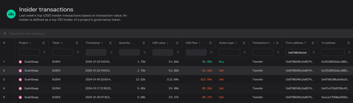 The insider transactions dataset filtered with the xSUSHI contract as the ‘From address’. The duplicate entry for the transaction with a ‘Buy’ and ‘Sell’ action type respectively tells us that both of the participants are top 100 tokenholders for SUSHI.