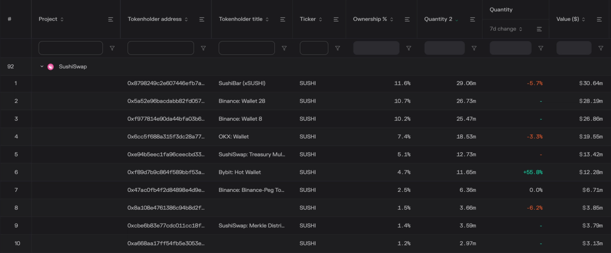 Analyze major tokenholder activity. An in-depth review shows that SushiSwap's largest tokenholder, the xSUSHI staking contract, experienced a 5.7% reduction in its SUSHI token balance over the past 7 days.