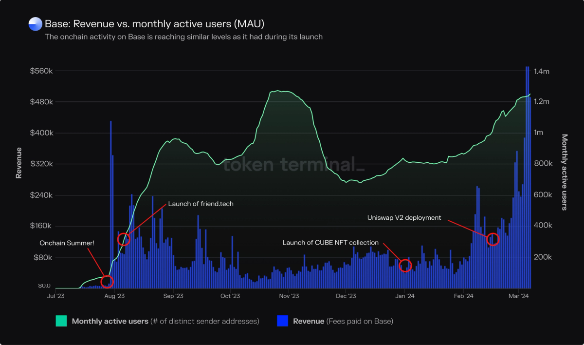 The onchain activity on Base is reaching similar levels as it had during its launch, with ~1.2M monthly active users (addresses) and ~$500k daily transaction fee revenue.
