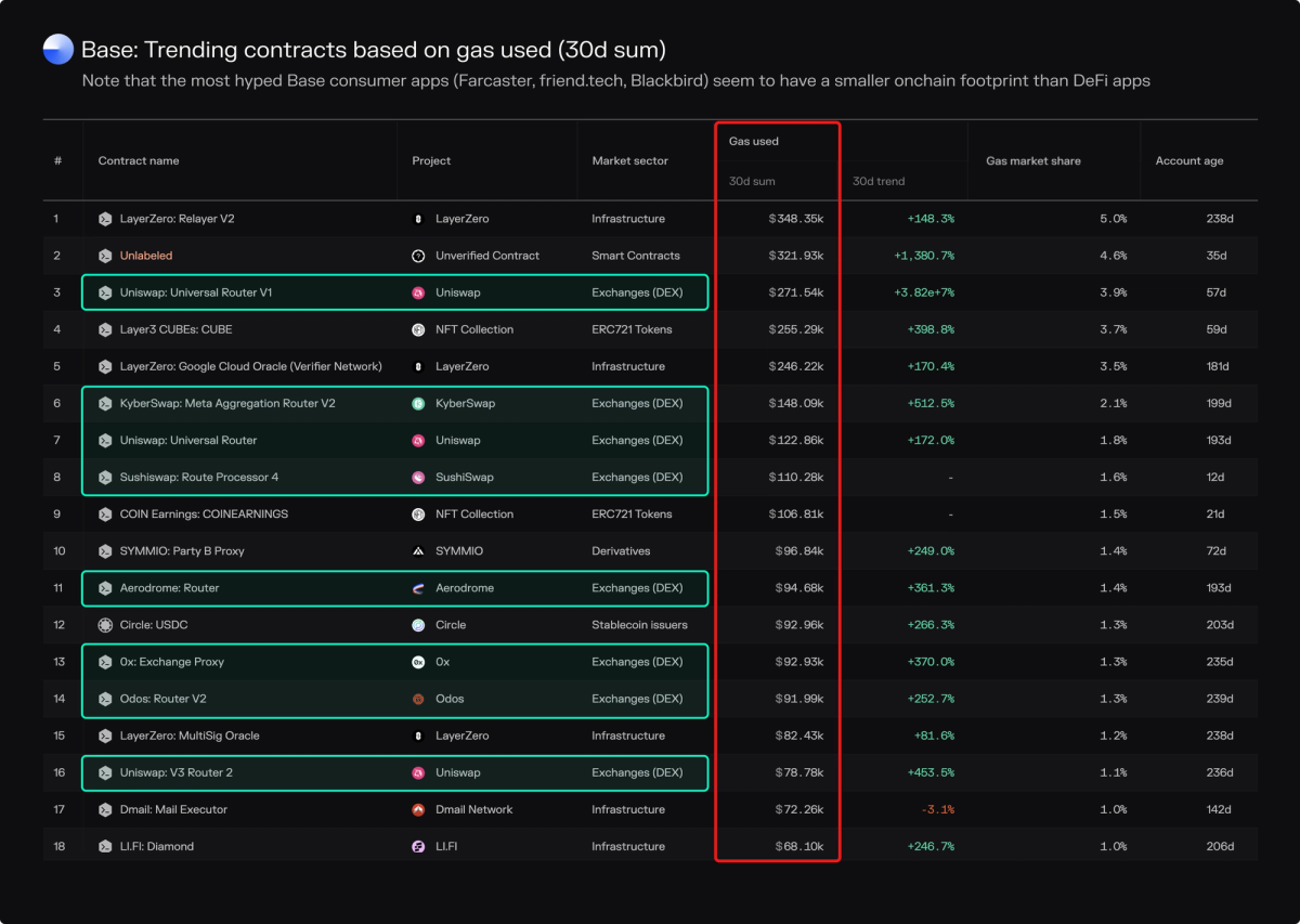 The most hyped consumer/social applications seem to have a lower onchain footprint than DeFi applications. One explanation for this could be that for most consumer applications, it’s enough that they’re “sufficiently decentralized”, with only the minimum viable part of the application running onchain.