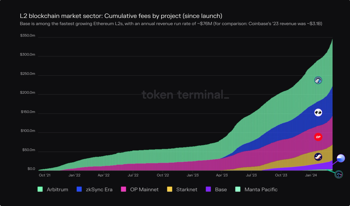 In terms of fees, Base is among the fastest growing Ethereum L2s, with an annual revenue run rate of ~$76M (for comparison: Coinbase’s ‘23 revenue was ~$3.1B).