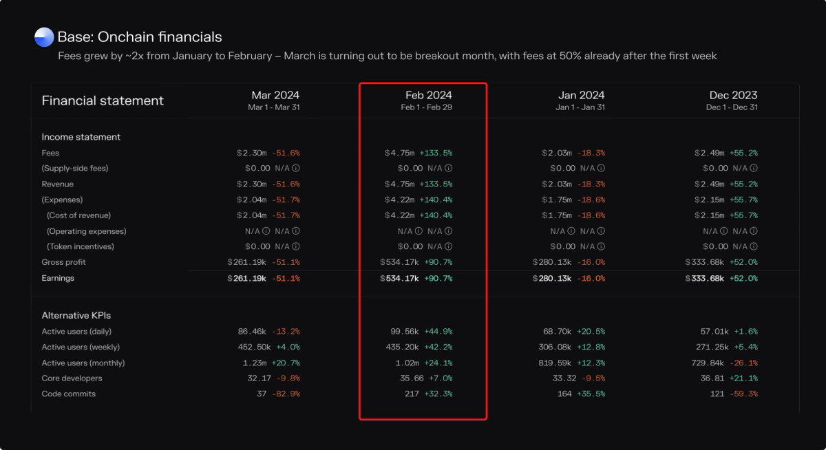 Operating expenses: N/A from onchain sources. But looking at GitHub data: Base has ~40 core developers. We can estimate the annual & monthly salary expenses using $200k as avg. compensation = $8m per year & $666k per month.